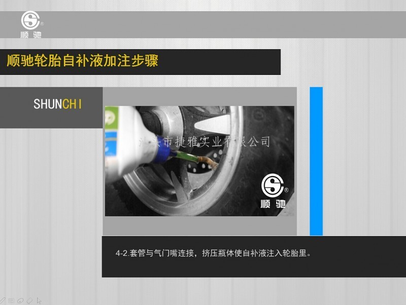 4-2.套管与气门嘴连接,挤压瓶体使自补液注入轮胎里.